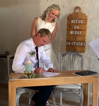 | C119. Troufoto van a2.b6.c3.d2.e6.f1.g2.h1.i2. Anelmé Henning *28-3-1988 en Hendrik (Hennie) Welman *3-6-1987 |